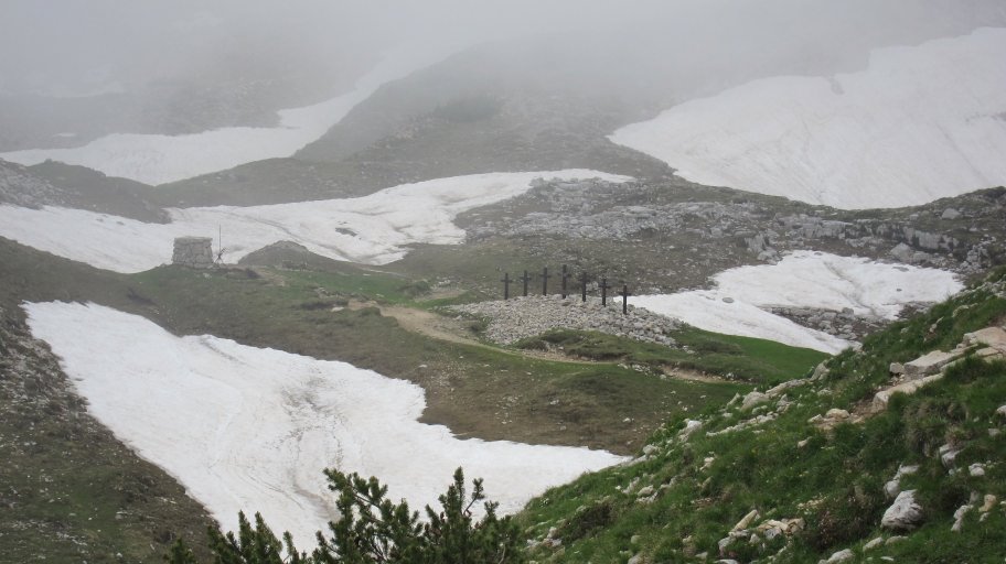 Am Punkt "Selletta del Groviglio" merkten wir dann, dass wir nicht mehr auf dem E5 waren, der heute nie die 2000 m Höhe erreichen sollte und wir bereits 2077 m hoch waren. Unter uns in Richtung Süden sahen wir die 7 Gedeckkreuze für die Gefallenen des 1. Weltkriegs. Da der Wegweiser zur Rifugio Lancia an dieser Stelle vom winterlichen Schnee abgebrochen war, mussten wir uns selber einen Weg suchen, um möglichst schnell wieder auf den von uns verpassten Original-E5 Weg zurückzukommen