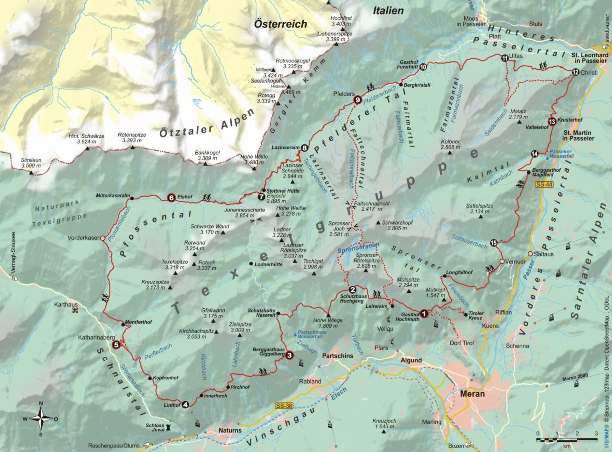 Karte des Meraner Höhenwegs - Unsere Tour begann am Parkplatz der Texelbahn in Partschins, wo wir unser Auto stehen ließen. Auf dem Parkplatz P3 konnten wir kostenlos parken.