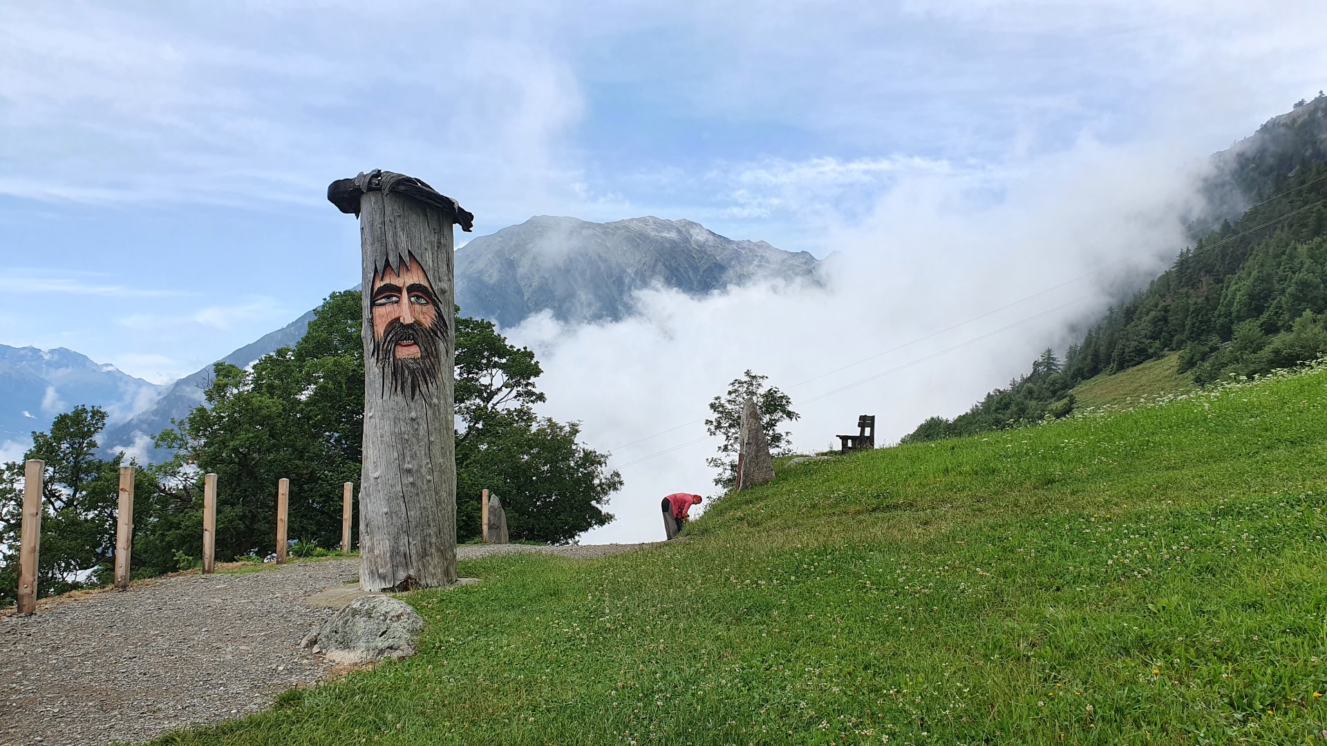 in der Nähe des Linthofs gibt es viele Holzfiguren.