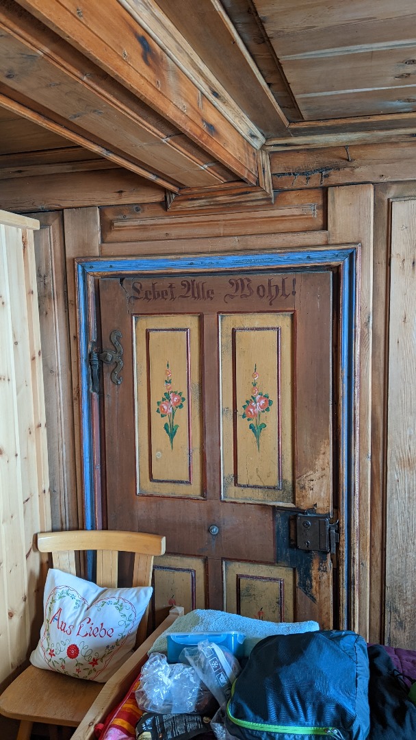 Die Tür zum Nachbarraum war schön bemalt, aber natürlich geschlossen, da die Zimmer getrennt vermietet wurden. Im Keller des Hauses, wo früher die Küche war, gab es moderne Sanitärräume mit warmer Dusche.