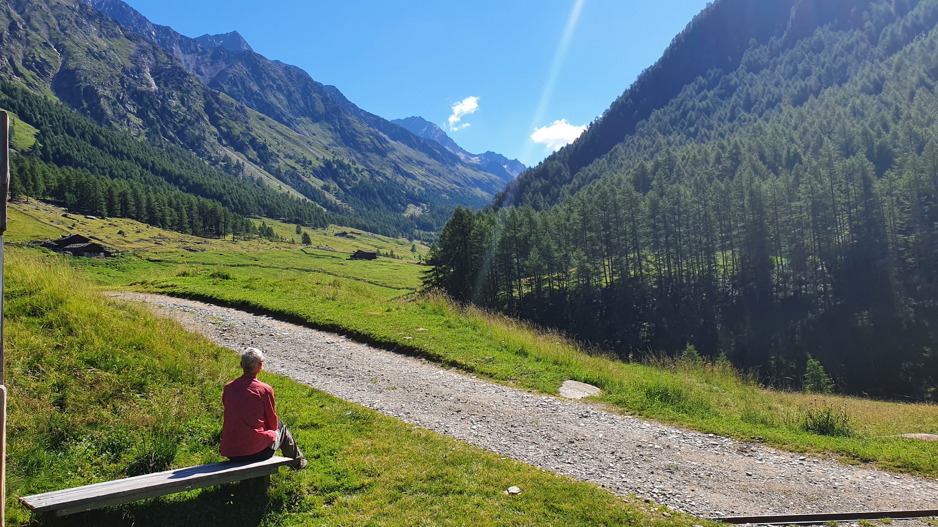 Blick zurück ins Tal. Unten fast am Ende des einsehbaren Teils des Tals liegt der Eishof.