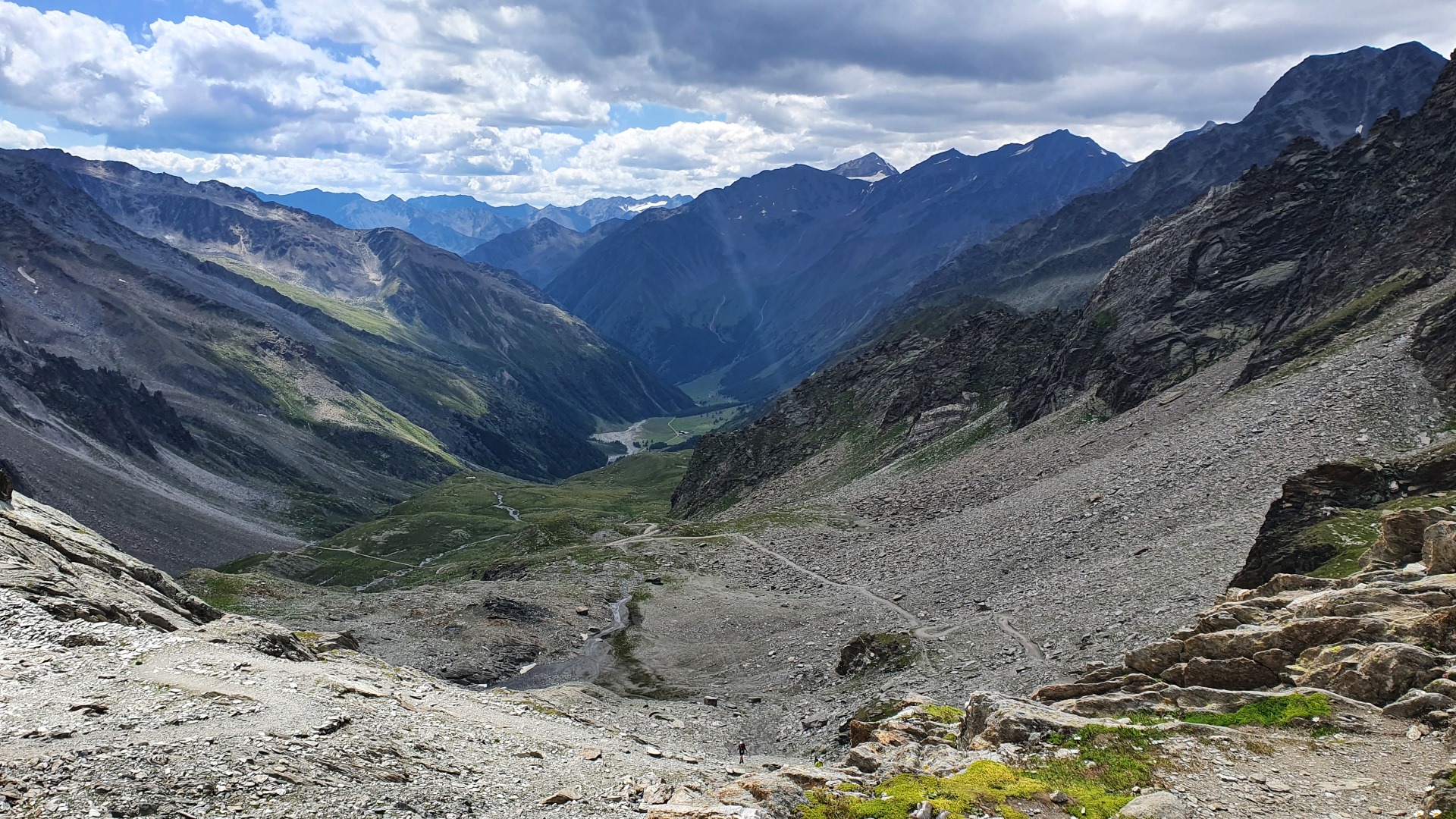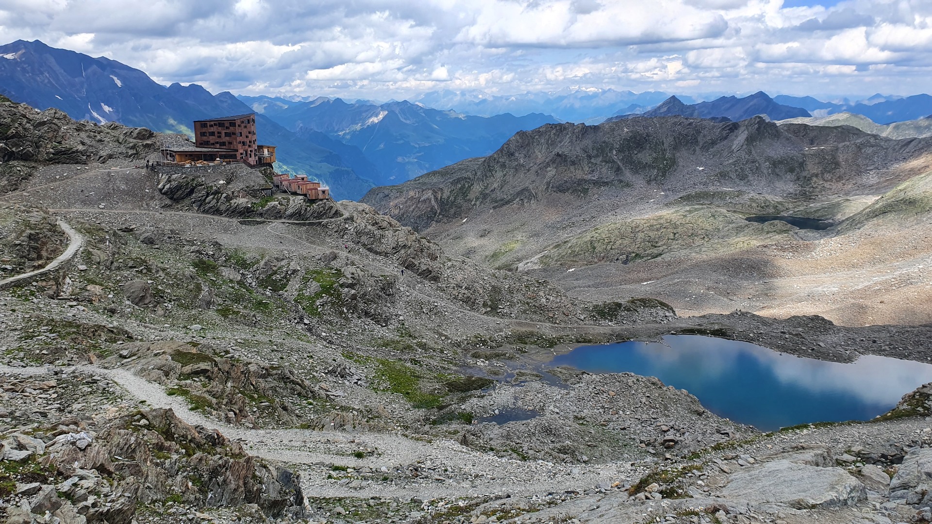 Vom Eisjöchl ist bereits die neue Stettiner Hütte zu erkennen. Die alte war 2014 durch eine Eislawine zerstört worden. Unterhalb des Neubaus sind die Holzbauten erkennbar, die in der Übergangszeit genutzt wurden. Der Neubau war erst 3 Tage vor unserer Ankunft neu eröffnet worden.