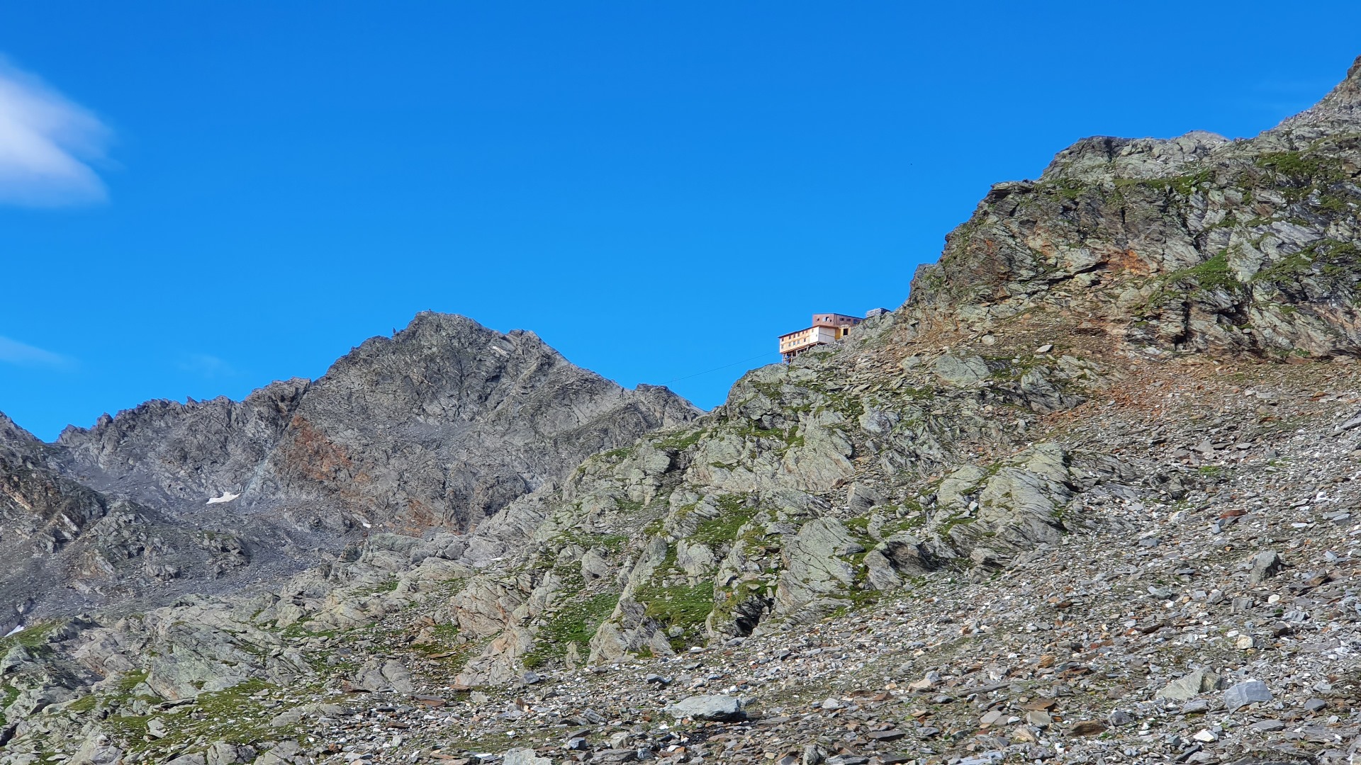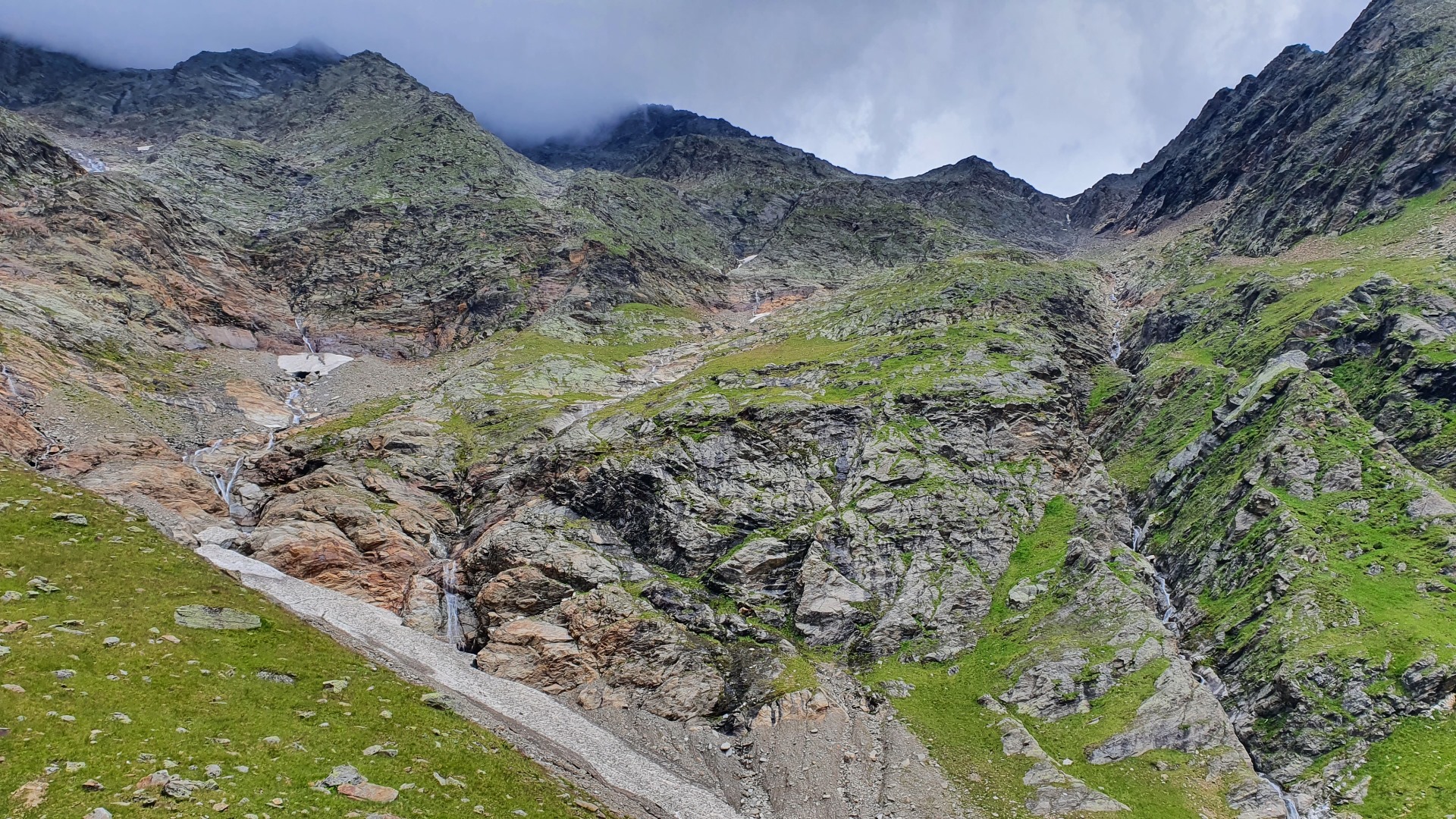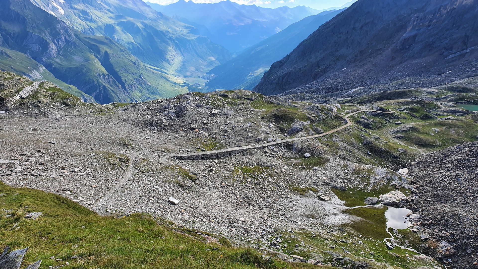 Unten ist ein künstlicher Damm zu erkennen. Dieser sollte die Schmelzwasserausbrüche des Grafferners bremsen. Dieser Gletscher ist jedoch in den letzten Jahren abgeschmolzen, so dass dieser Damm ohne Funktion ist. Kurz vor dem Damm geht der Weg zur Zwickauer Hütte ab.