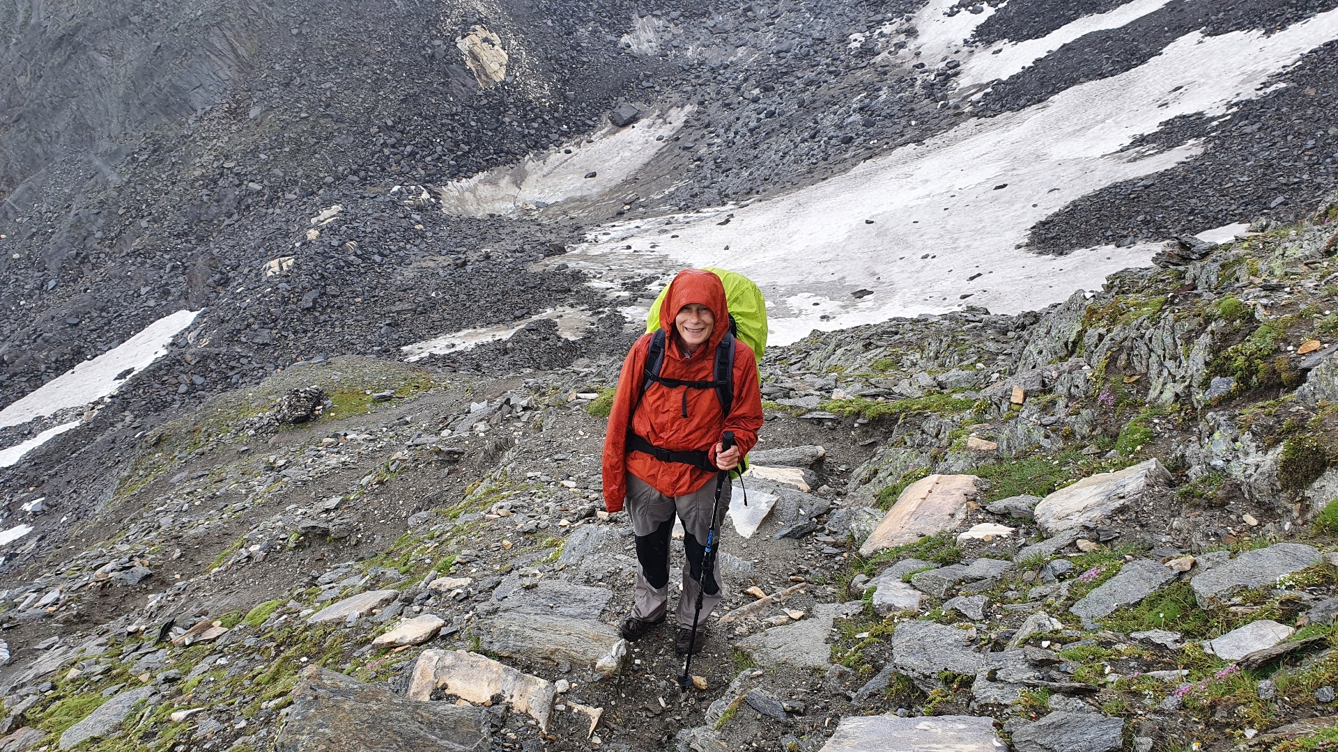 Die letzten 300 Höhenmeter erwischte uns dann noch ein Wettersturz. Bei dem anfangs sehr schönen Wetter hatten wir uns Zeit gelassen und den Weg mit einigen Pausen genossen. Das schlechte Wetter kam über den Alpenkamm mit starken kalten Fallwinden. Hier hätten wir unsere Handschuhe gebrauchen können, wollten aber nicht erst den Rucksack absetzen um diese darin zu suchen.