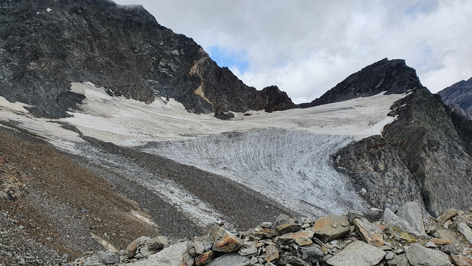 Dies ist alles was vom Planferner übriggeblieben ist. Die Zwickauer Hütte wurde 1899 direkt neben dem Planferner errichtet. Jetzt gibt es um die Hütte nur noch Steine.