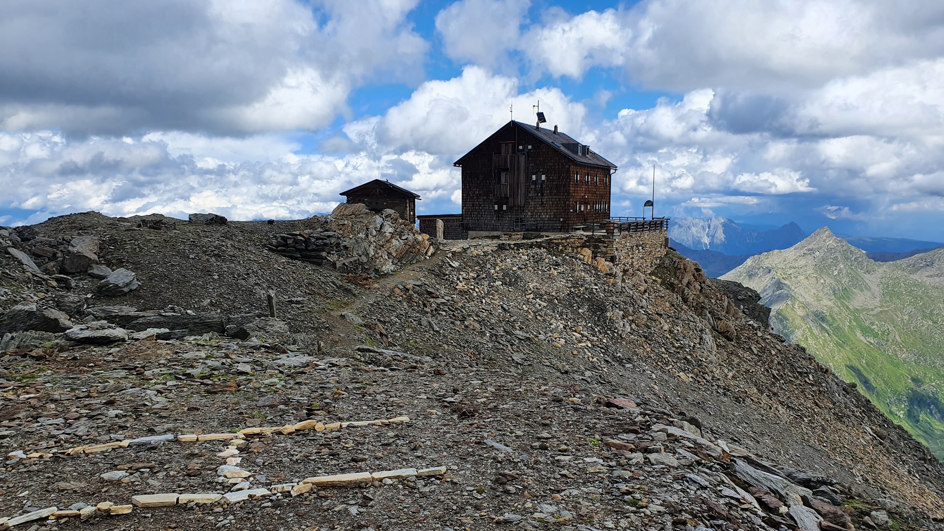 Auf diesem Bild ist gut der Behelfsbau der Hütte zu sehen, hinter dem die neue Hütte hinausragt.