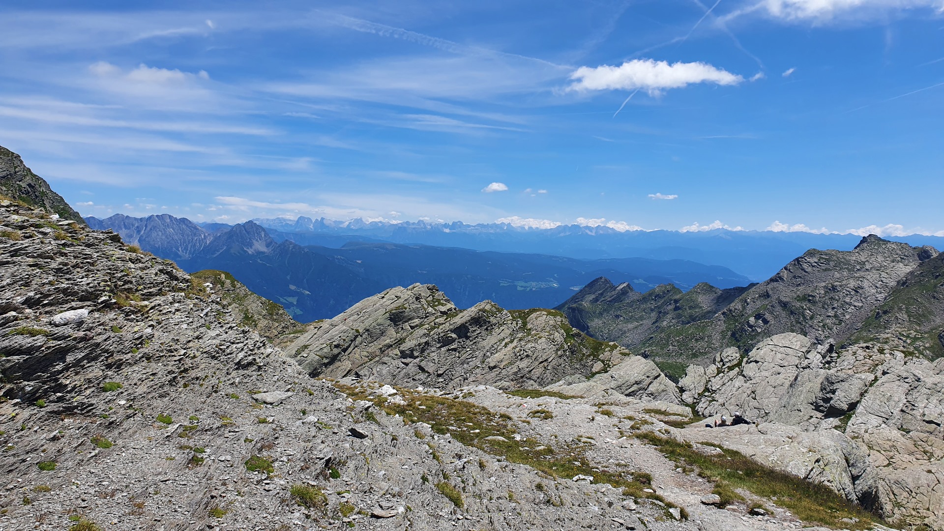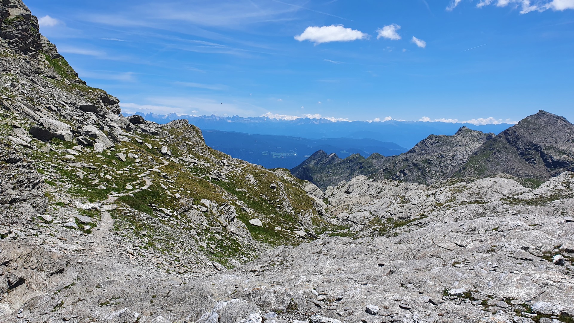 Vom Spronser Joch (2581m) sind im Hintergrund die Dolomiten zu sehen.