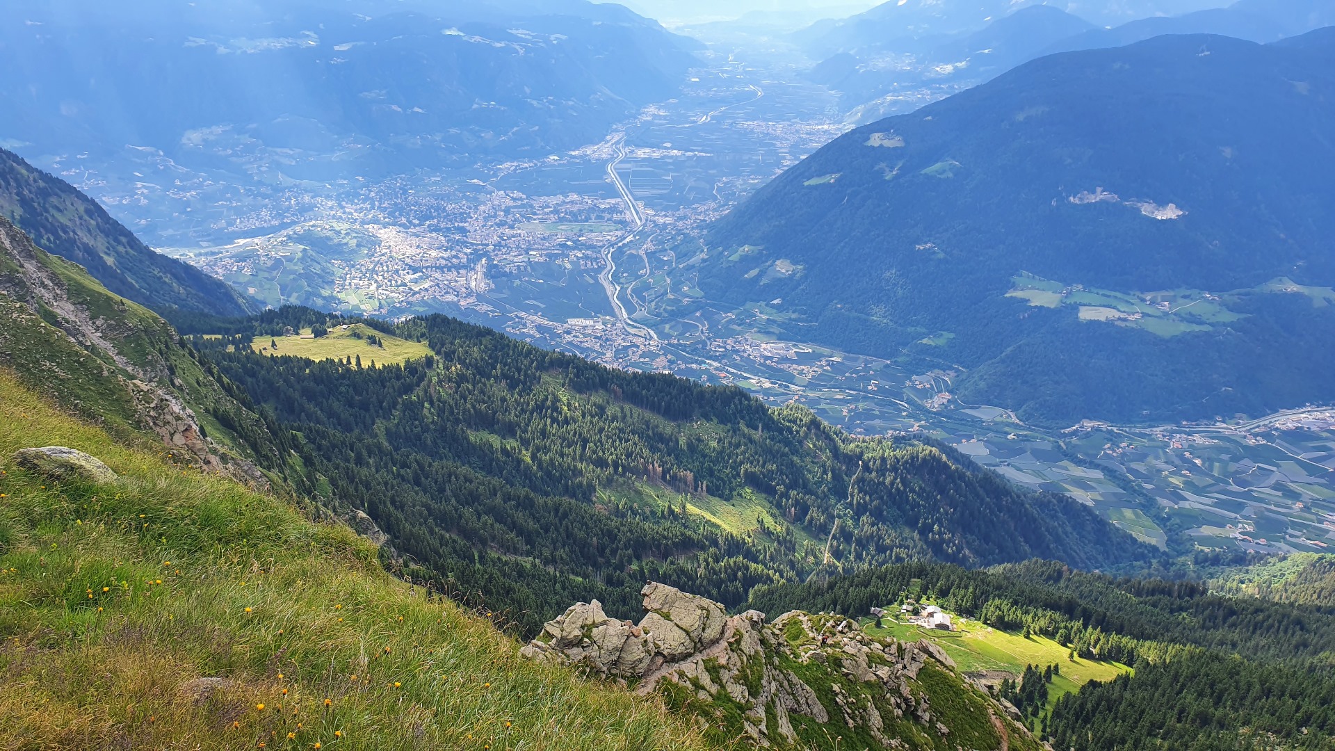 Von der Hochgangscharte ging es steil bergab. Der Steig war sehr ausgesetzt aber gut mit Drahtseilen gesichert. Weiter unten war der Weg, wie in der Mitte auf dem Foto erkennbar, leichter geworden. In der Verlängerung des Weges ist bereits das Ziel, das Hochganghaus, zu sehen. Ganz unten im Tal ist Meran zu erkennen.