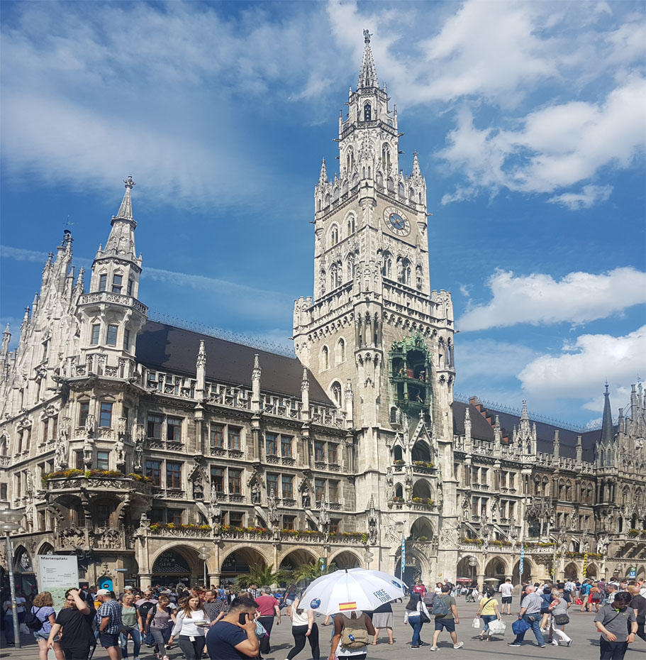 Nach Ankunft auf dem Hauptbahnhof in München ging es als erstes zum Marienplatz, dem Startpunkt des Traumpfades München -. Venedig. Nach dem Foto musste ich erst einmal die Globetrotter-Filiale aufsuchen, um mir neue Wanderschuhe zu kaufen. Just am Marienplatz löste sich die Sohle von meinen alten bewährten Wanderschuhen, die mich unter anderen auf alle Nepal-Touren begleideten.