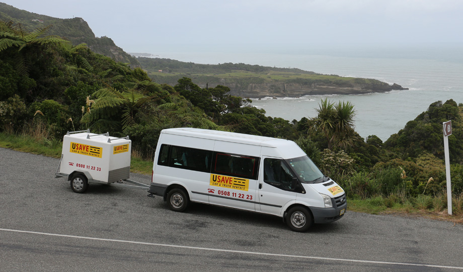 Unser Minibus, der uns durch Neuseeland brachte. Unsere Reisegruppe bestand aus einem Reiseleiter, der gleichzeitig Fahrer, Einkäufer und oft auch als Koch wirkte sowie mit uns aus 10 Reisenden.