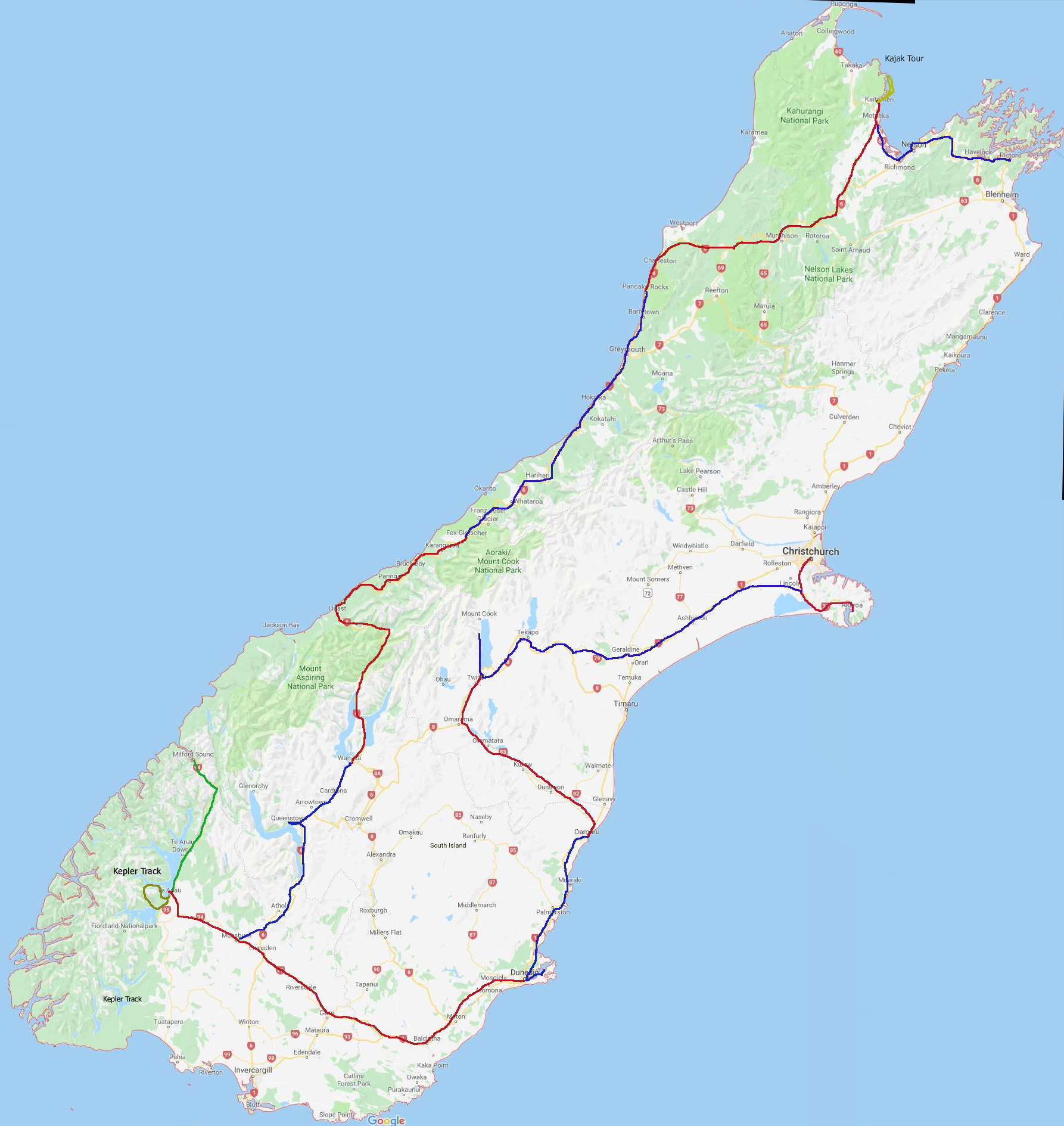 In der Karte ist die Reiseroute markiert. Dem Kepler-Track und der Kajaktour im Norden der Südinsel wurde je ein einzelner Menüpunkt gewidmet.