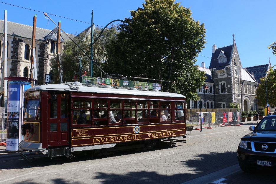In Christchurch gibt es noch wunderschöne historische Straßenbahnen. Bei unserer Ankuft waren es 31 °C, so dass wir in den knapp zwei Stunden Aufenthalt nicht allzu viel angesehen haben.