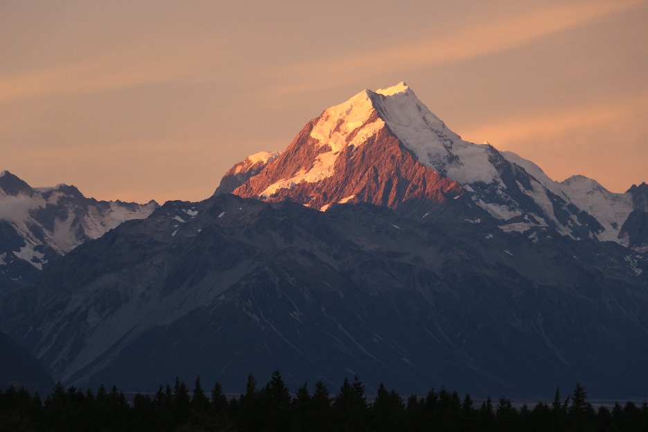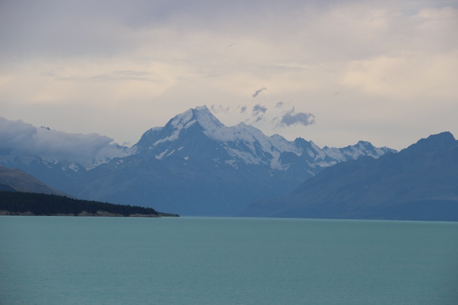 Bei einem Halt am Lake Pukaki ist im Hintergrund der Mt. Cook, mit 3.754 m Höhe der höchste Berg Neuseelands, zu sehen.