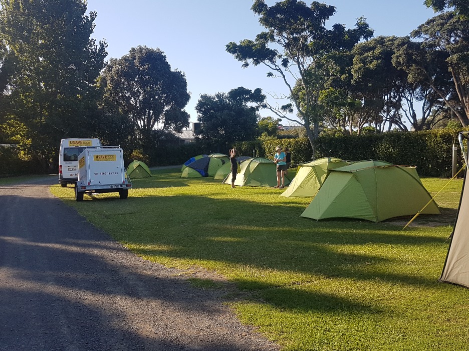 Ankunft und Aufbau unser Zeltstadt an der Hahei Beach auf der Coromandel Halbinsel. Hier verbringen wir unsere letzten 2 Nächte im Zelt.