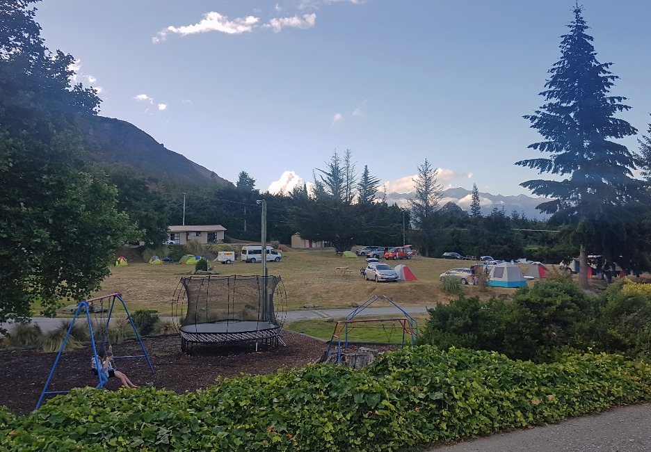 Campingplatz in Wanaka. Links hinten sind unsere Zelte und unser Minibus zu sehen. Das Wetter war zum Glück wieder besser geworden.