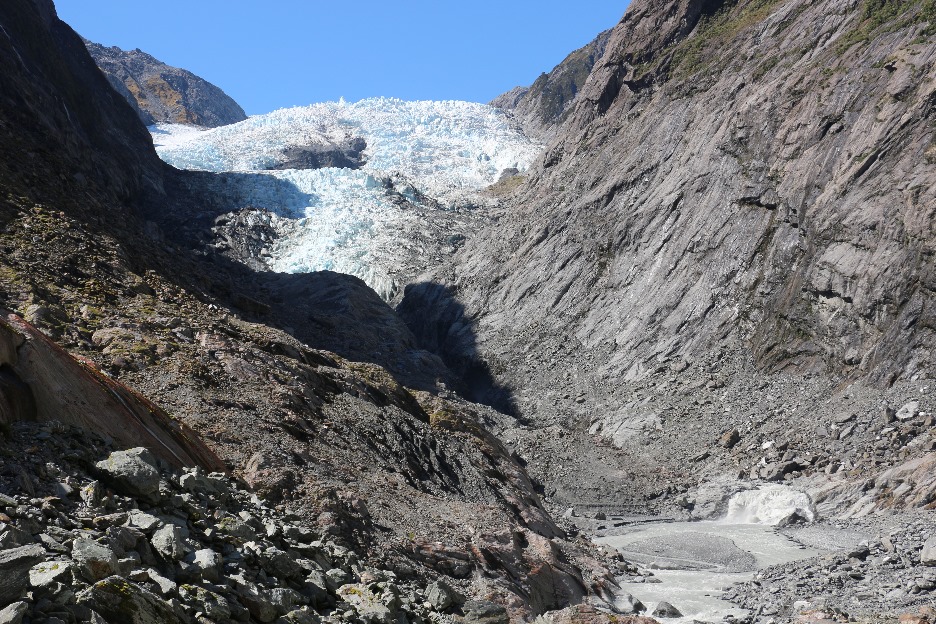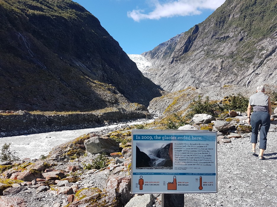 Der Franz Joseph Glacier reichte 2009 noch bis zu diesem Schild. Jetzt ist er von hier aus kaum noch zu sehen.