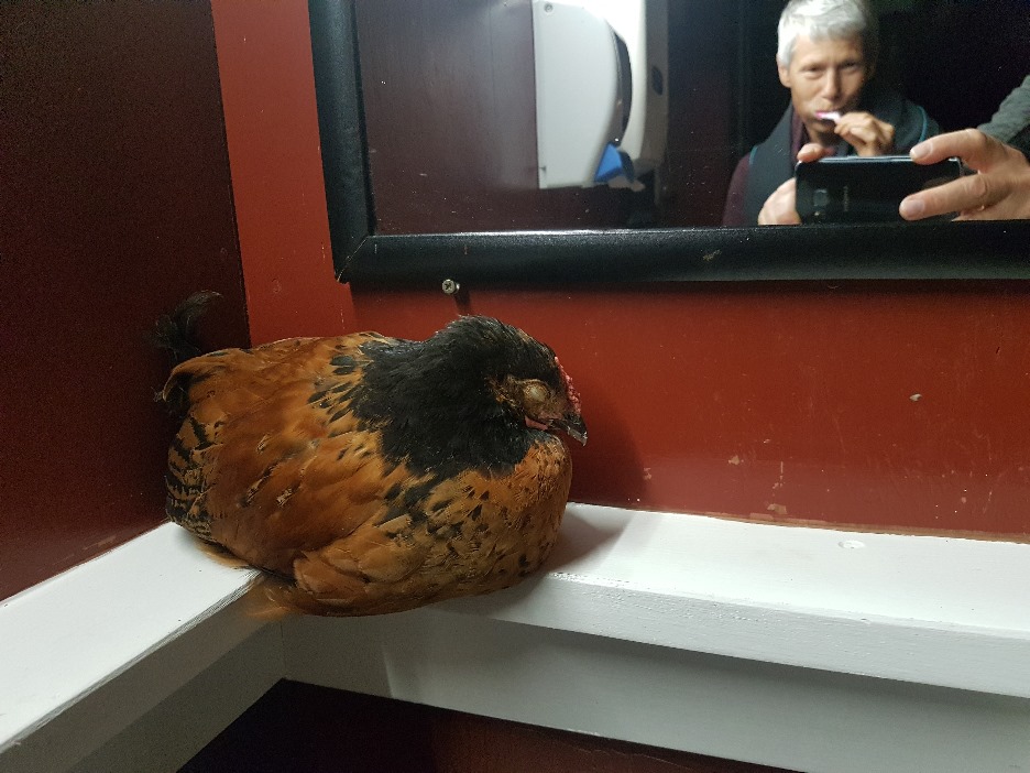 Der besondere Schlafplatz von Huhn Emma in der Waschecke. Unser Zähneputzen störte sie wenig.