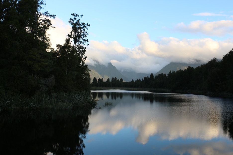 Abends wanderten wir noch zum berühmten Spiegelsee Lake Matheson. Allerdings blieb uns der Blick auf den Mt. Cook und den Mt. Tasman verwehrt.