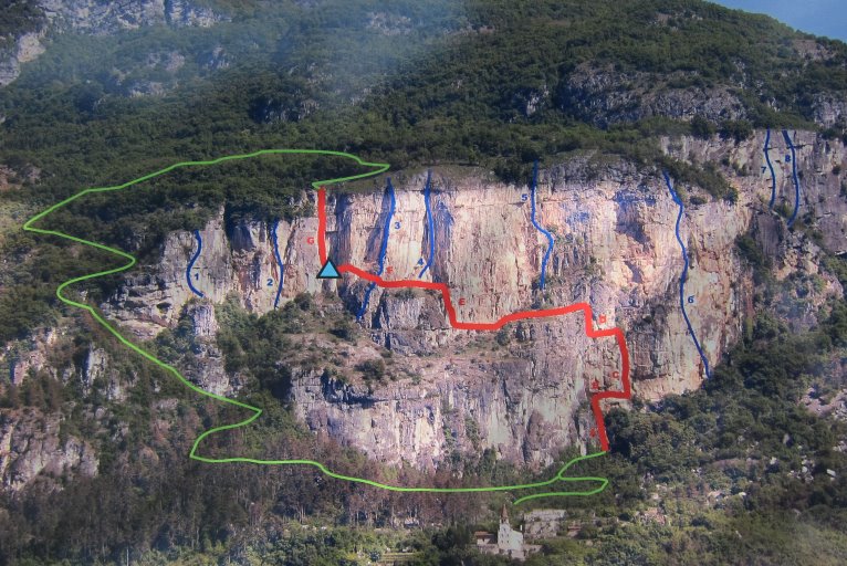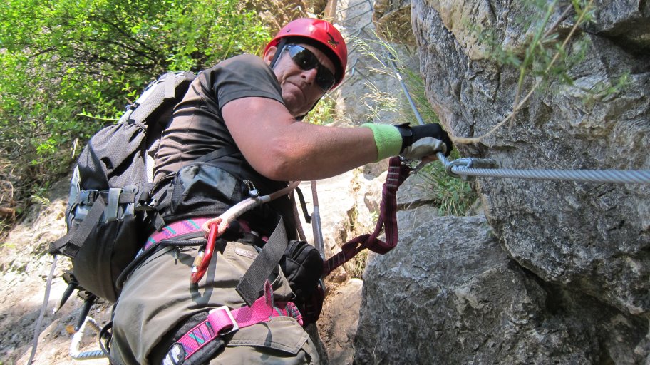Obiges Foto habe ich von der Hinweistafel am Beginn des Klettersteigs gemacht. Es zeigt gut den Verlauf (rote Markierung) des Klettersteigs durch die Wand. Der Rückweg (grün) ist relativ bequem zu gehen.